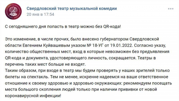 Татарстан, Башкирия, Саратовская, Тюменская, Орловская области... В этих регионах отменены QR‑коды для посещения общественных мест, включая театры и музеи. В Свердловской области губернатор подписал подобное распоряжение ещё в январе, в Кемеровской – в начале февраля. При этом ни там, ни там всплеска заболеваемости не наблюдается.