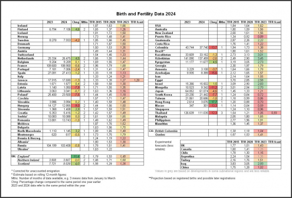 Динамика рождаемости в 2024-м году по странам мира относительно тех же показателей в 2023-м году и ранее