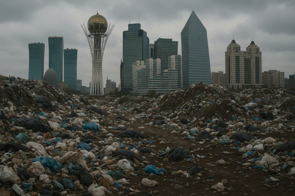 В нескольких километрах от правительственных зданий Астаны обнаружена масштабная несанкционированная свалка площадью около 11 000 кв. м на землях, предназначенных для жилищного строительства.
