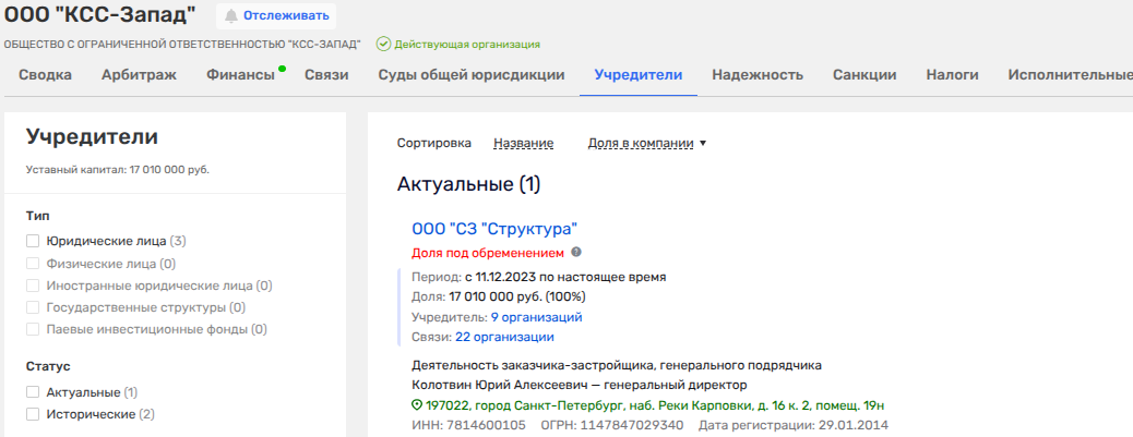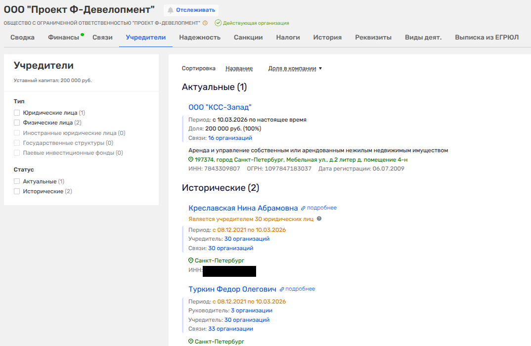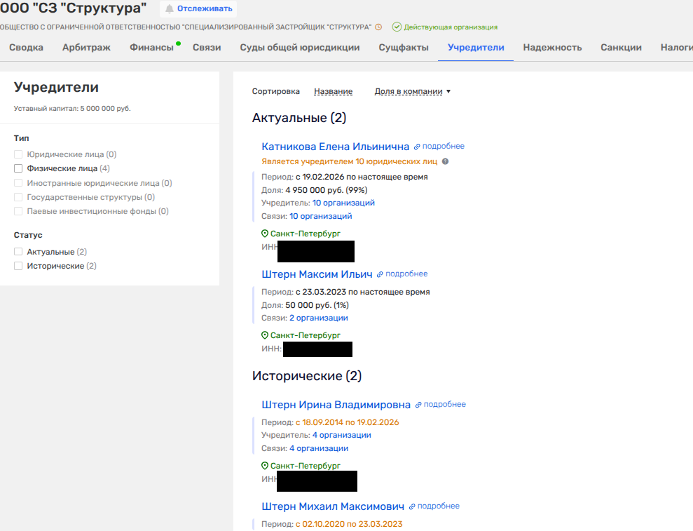 Нина Креславская и Фёдор Туркин — мать и отчим главы строительного комитета СПБ Игоря Креславского - уступили место новому собственнику ООО «КСС-Запад». За этим юридическим фасадом стоят питерский девелопер Максим Штерн (ГК ПСК) и его партнёр Елена Катникова. Примечательно, что сама Катникова всего месяцем ранее, в феврале 2026-го, уже заменила во владельцах Ирину Владимировну Штерн.