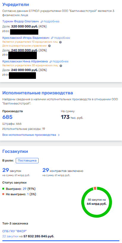 Вот, к примеру, ООО «БАЛТИНВЕСТСТРОЙ», где лично у чиновника Креславского 30% (остальное у матери и Туркина), наколотило уже 61 млрд рублей, из которых вышеуказанный фонд подмахнул почти 58 млрд рублей. Это вам не скрепки сельской администрации поставлять! Тут обороты огого.