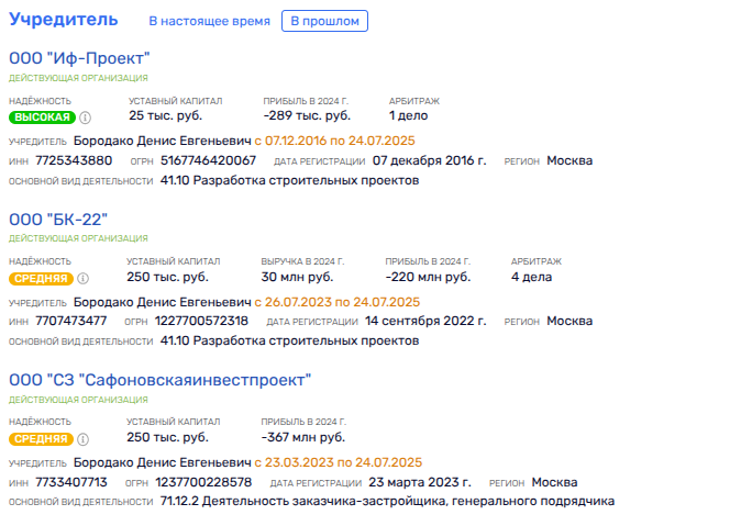 Вконце июля 2025 года Денис Бородако, который нет-нет, да мелькнет в освоении бывших госземель столицы, провернул сразу три сделки. Он продал три юрлица в Москве - ООО «Специализированный застройщик «Сафоновскаяинвестпроект», ООО «Иф-Проект» и ООО «БК-22». Комплектом к сделке пошли и дочерние активы ООО «БК-22» фирмы из сферы управления недвижимостью - ООО «Иристо» и ООО «Мелисса».