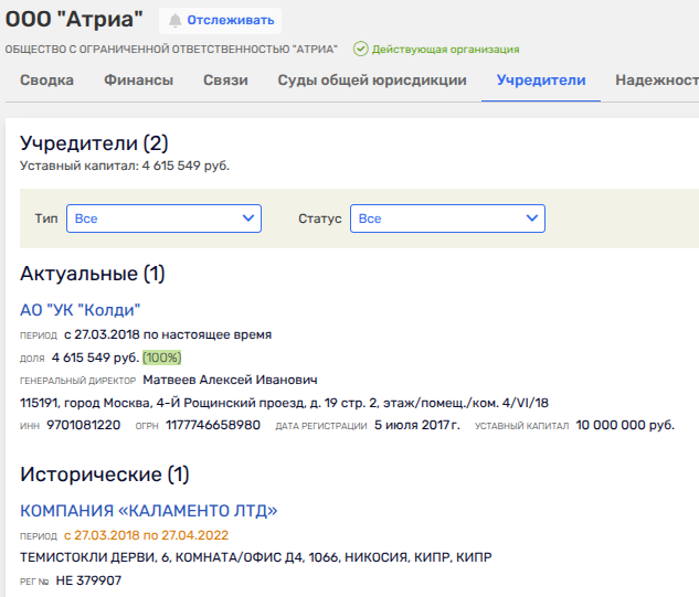 Занимательно: Каламенто ЛТД в 2018-2022 годы было владельцем ООО «Атриа», которое в итоге перешло к дивизиону Coldy - АО УК «Колди». Это еще раз косвенно подтверждает тесную связь Крючкова с Карчевым.