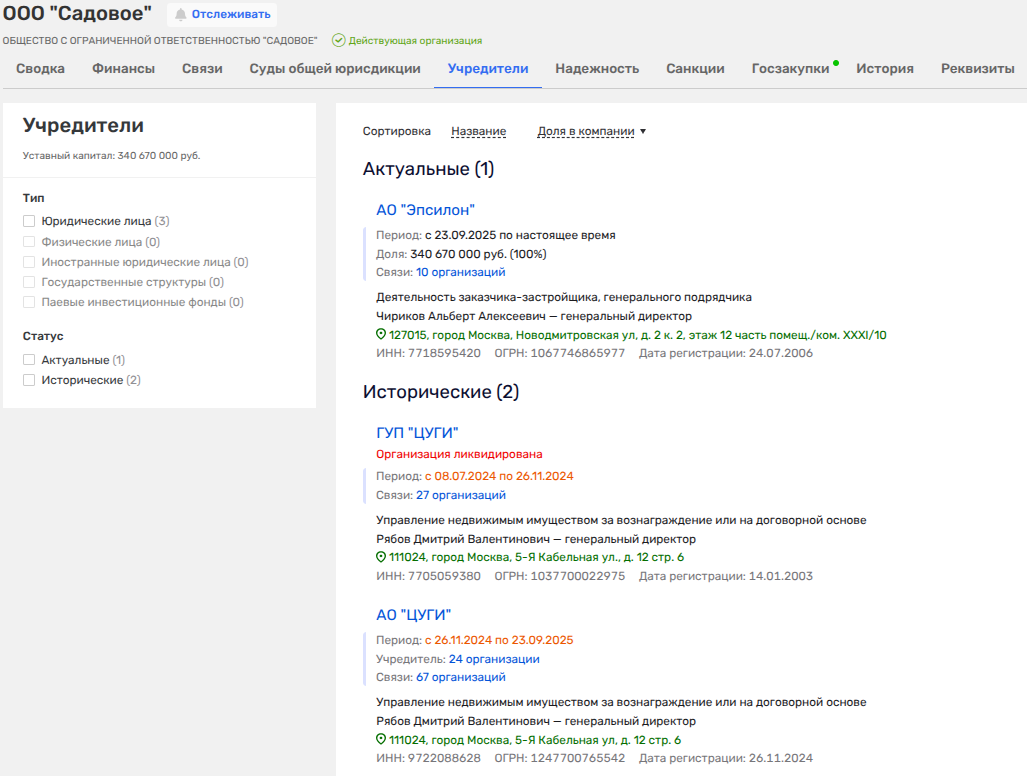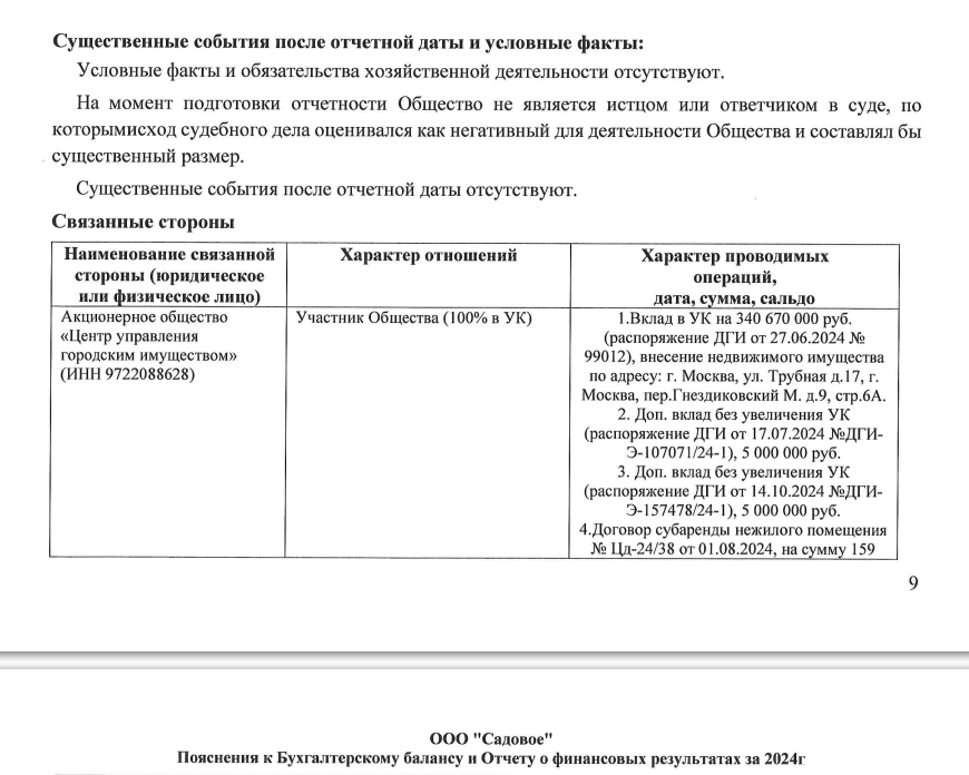 Проданное ООО «Садовое» было учреждено ЦУГИ в июле 2024 года и явно для последующей продажи. В уставный капитал было вкачено 340,67 млн рублей. Помимо этого, ЦУГИ внесло в уставный капитал недвижимость по ул. Трубная, 17 и пер. М. Гнездиковской, 9 стр. 6А.