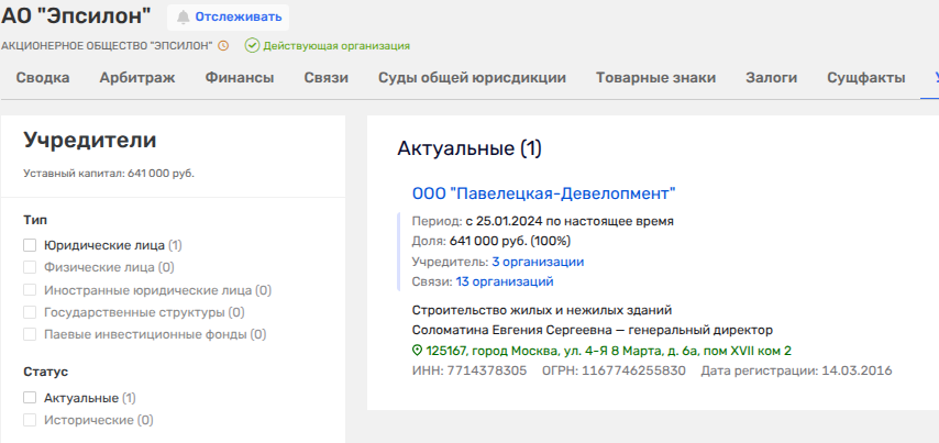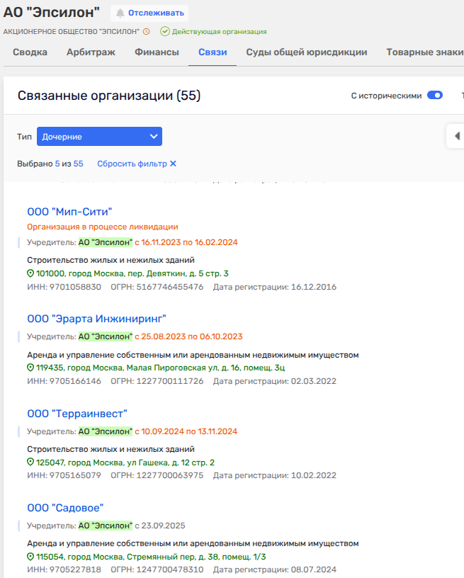 Через тот же АО «Эпсилон» в 2023-2024 годы выкупалась у того же ЦУГИ целая пачка ООО со слитыми на их баланс государственные активами. Среди таковых оказались «Мип-Сити», «Эрарта Инжиниринг», «Терраинвест» и «Конструкт-Групп». Все они бывшие активы, на которых числится имущество.