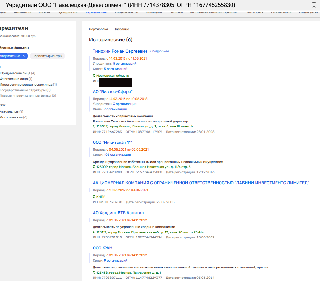 Новым владельцем ООО «Садовое» стало АО «Эпсилон» - еще один бывший госактив в форме ГУП, некогда принадлежавший департаменту имущества Москвы, но с января 2024 года оказавшийся чудным образом в руках некоего ООО «Павелецкая-Девелопмент». Последнее также не чужое Тимохину. В 2016-2021 годы он лично был в числе владельцев, имея в партнерах кипрскую кубышку - Лабини Инвестментс Лимитед, которое связывали с банкиром Алексеем Богачевым. Именно Богачев продал свой банк «Система» ГК Самолет, где доли имеет брат губернатора Подмосковья Максим Воробьев.
