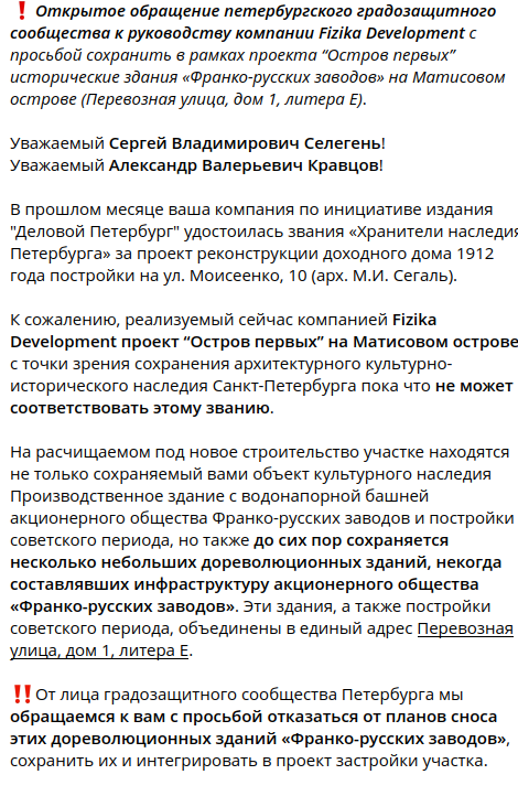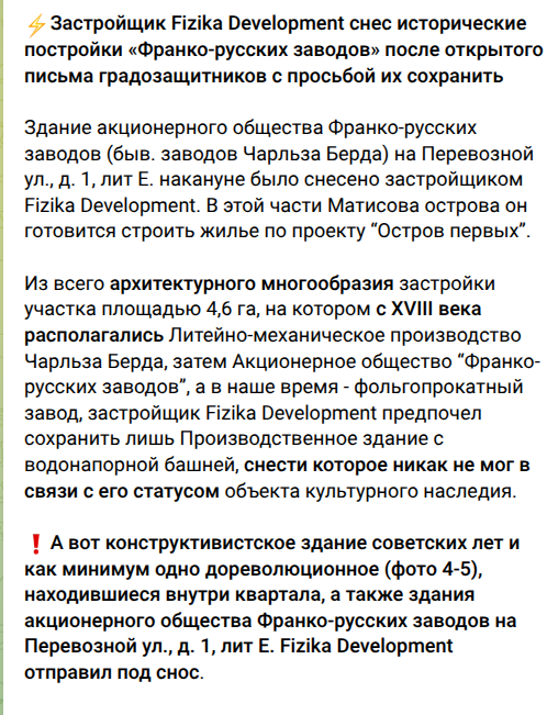 После открытого письма градозащитников с просьбой сохранить постройки, застройщик Fizika Development словно наперекор поспешил снести здание советских лет и как минимум одно дореволюционное, находившиеся внутри квартала, а также здания акционерного общества Франко-русских заводов на Перевозной ул., д. 1, лит Е. И словно бы в насмешку - буквально за месяц до этого компания Fizika Development удостоилась звания «Хранители наследия Петербурга».