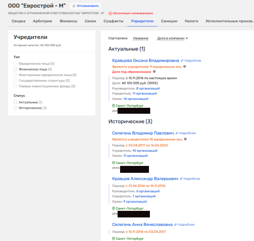 На сегодня ООО «Еврострой-М» ликвидирован, а ООО «СЗ Г20» полностью передали Владимиру и Сергею Селегень.