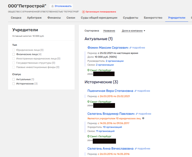 ООО «Петрострой» было ликвидировано в апреле 2025 года после процедуры банкротства, оставив не выплаченными в бюджет 22 млн рублей налогов. Перед банкротством фирму слили ширме, чтобы не садить пятно на белое пальто репутации семейства Селегень-Макаровых.
