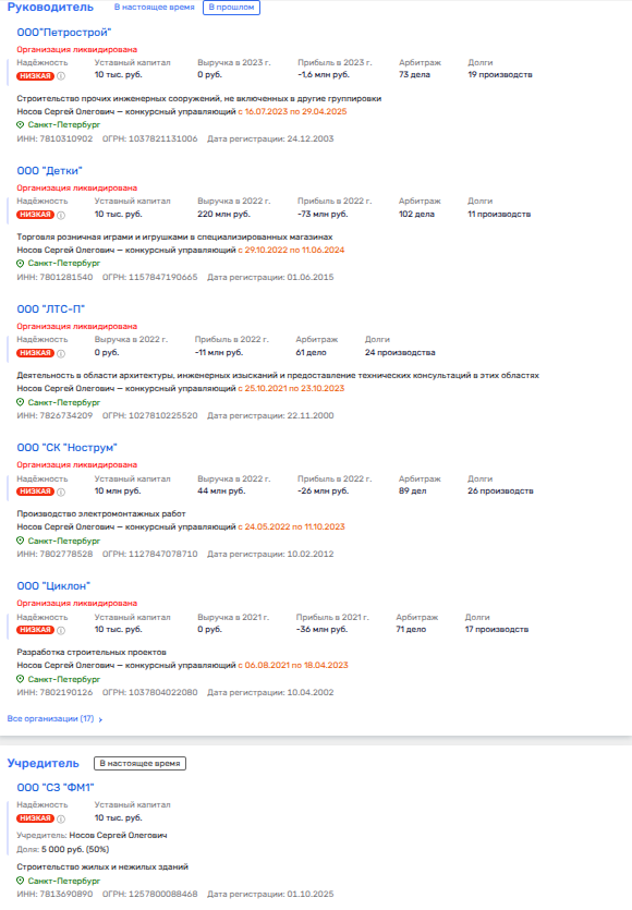 Банкротство этой кубышки с миллиардным бюджетным оборотом по госконтрактам вызывает вопросики. Ведь банкротил её как конкурсный управляющий некий Сергей Носов, который в октябре 2025 года получил 50% доли в ООО «СЗ ФМ1». Его партнёром является Сергей Селегень, а директором в фирме - Александр Кравцов. Вопрос, а за какие услуги Носов получил плату в виде доли в компании? Неужели, не все было гладко с тем токсичным банкротством?