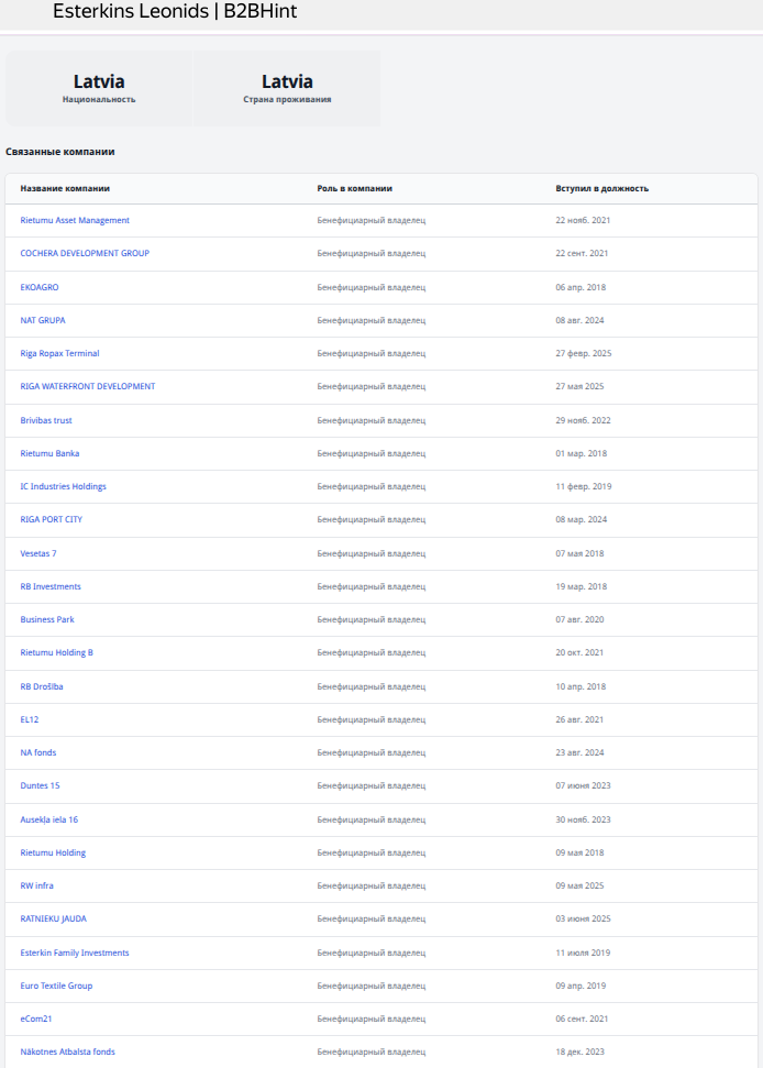 Сам Эстеркин - бенефициар одного из крупнейших банков Латвии Rietumu Banka, у которого в России есть две фирмы - оформленные на RB INVESTMENTS ООО «КИ ИНВЕСТ» и ООО «Мегахаус».
