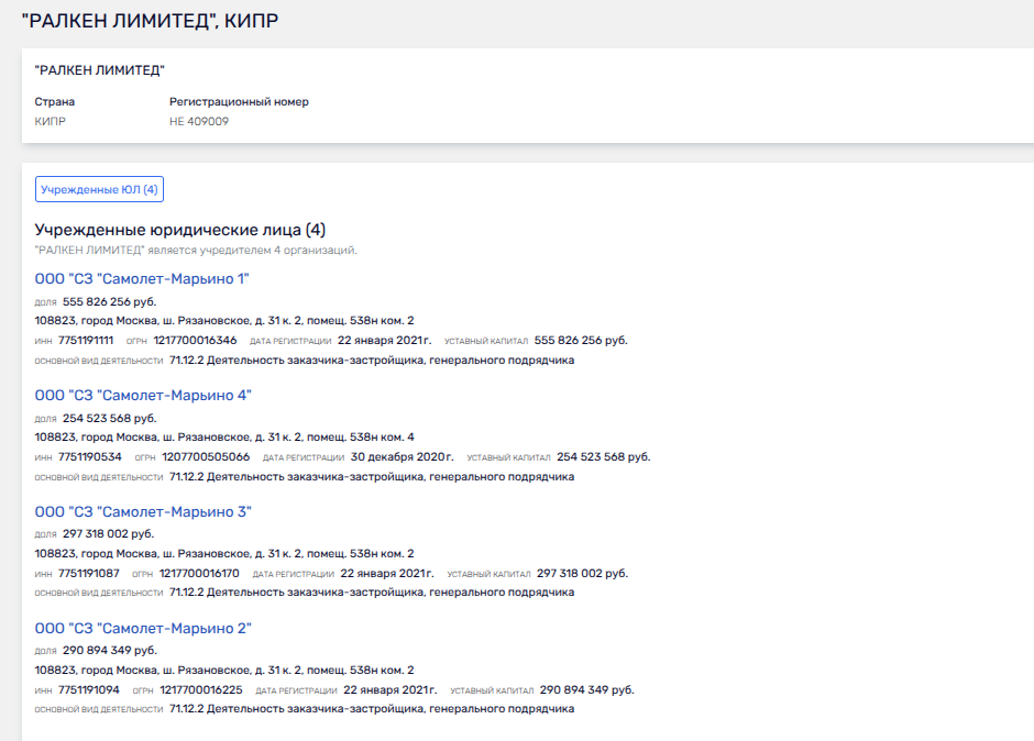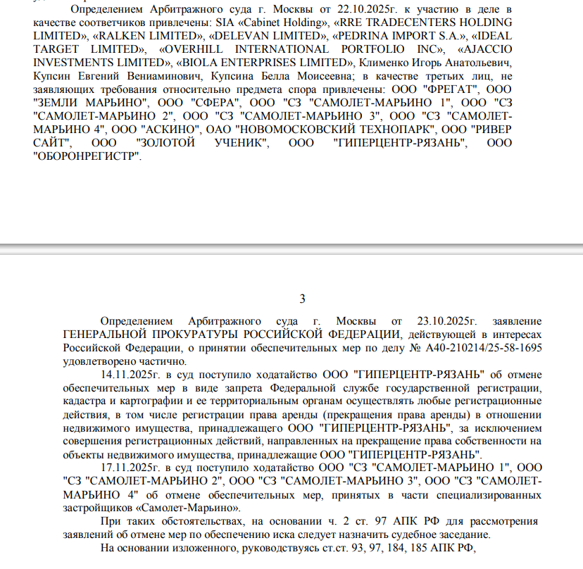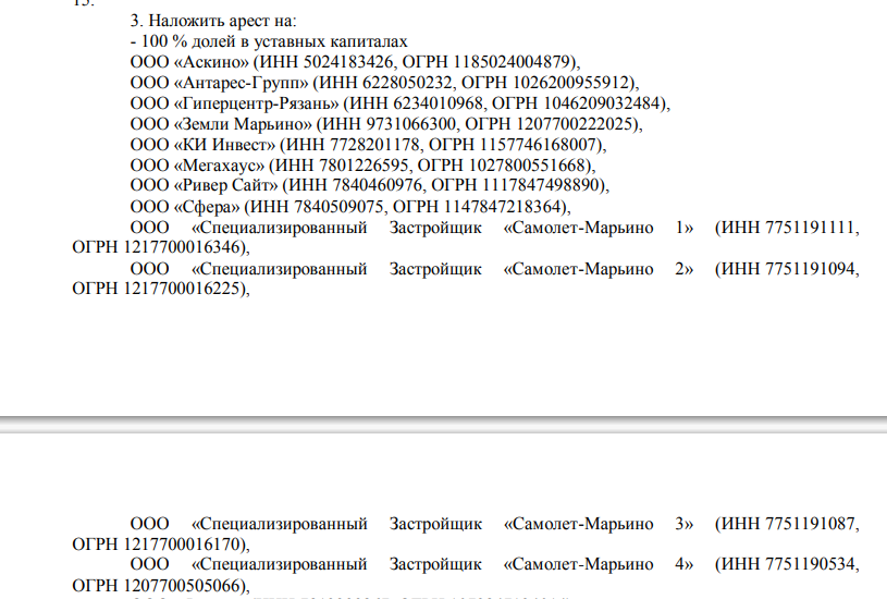 Судя по материалам дела, в котором участвует целая пачка российских и иностранных юрлиц, включая офшоры, и граждан, под арестом оказались специализированные застройщики как раз таки «Самолет-Марьино» - ООО СЗ «Самолет-Марьино 1», ООО СЗ «Самолет-Марьино 2». ООО СЗ «Самолет-Марьино 3» и ООО СЗ «Самолет-Марьино 4». В конце ноября будет рассмотрена просьба девелопера о снятии ареста с компаний.