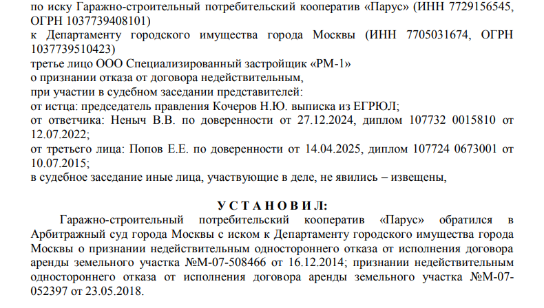 ГСК Парус категорически не устроил посыл собирать чемоданы и идти на все четыре стороны из-за того, что гаражи определили под снос. ГСК подало иск к департаменту горимущества, а застройщик стал третьим лицом.