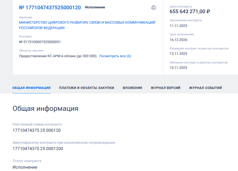 Новенький же контракт Минцифры выглядит весьма мутно - оказание услуг по обеспечению функционирования, администрирования и бесперебойной работы коммуникационных сервисов автоматизированного рабочего места на базе общедоступной инсталляции. Много сложных слов, за которые можно и почти - 0,7 млрд рублей отсыпать. Кто там разбирается в таких сложных материях.