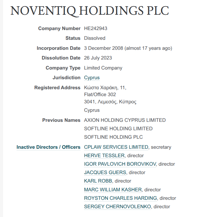 А в NOVENTIQ HOLDINGS PLC вместе с Боровиковым мы наблюдаем и Сергея Черноволенко - еще одного топа Софтлайн, который имеет связи вне страны, так как ранее занимал должность помощника президента банка International Bank of Trade & Commerce, был главой департамента в Xerox Россия.