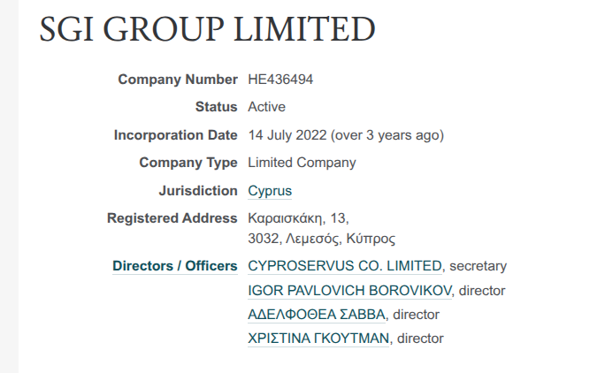 В 2023 году NOVENTIQ HOLDINGS PLC, прописанное на Кипре, прихлопнули, но IGOR PAVLOVICH BOROVIKOV по-прежнему остается директором иных кубышек, например, кипрского SGI GROUP LIMITED, созданного в июле 2022 года, то есть уже после начала СВО, и до мая 2025 года он контролировал DESTRESS ASSETS LIMITED, вместе с неким DMITRY MAGONYA. Последний директор вполне действующего кипрского SANIFOR HOLDING LTD и MAGNUSFOR HOLDING LTD, коими рулит с IGOR KOSKIN.