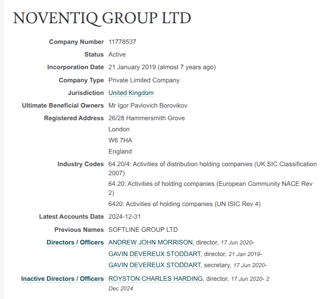 Занятно, что на сайте Noventiq фирма Noventiq Holdings PLC фигурирует как действующая с офисом в Лондоне. При этом в числе руководителей там все тот же Черноволенко, а вот Боровикова решили припрятать и не светить.
