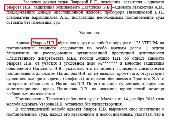 Параллельно с Магомедовыми под следствие попали и многие их приближенные. Одним из таковых стал Эльдар Нагаплов, гендиректор ОАО "Глобалэлектросервис", входившего в "Сумму" Магомедовых. В 2018 году Нагаплова объявили в розыск по делу о хищениях 752 млн рублей, выделенных на подготовку ЧМ по футболу. И вот здесь и кроется главная "фишка" - интересы Нагаплова в суде представлял Игорь Викторович Уваров.