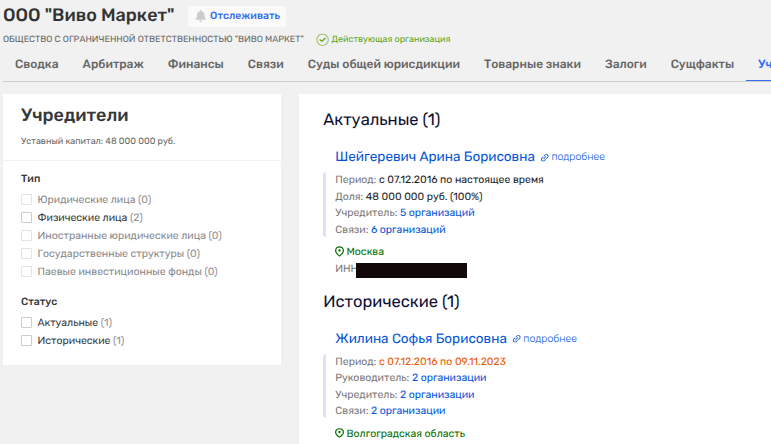 Как только появился анонс о концессии, в те же дни у фирмы меняется владелец. Виктория Абрамова передает фирму-пустышку с большими амбициями в руки «Виво Маркет», при этом оставшись ее директором.
