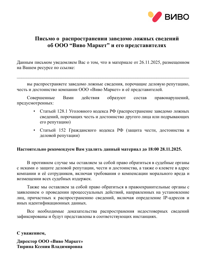 По закону, если человек или фирма считает, что их достоинство и репутацию ущемили, оно должно привести конкретные строчки из материала. Но граждане, которые заявились как представители «Виво Маркет», даже не стали заморачиваться такими мелочами. Более того, они с порога, открыв дверь с ноги, заявили, что вы, мол, распространяете заведомо ложные сведения, порочащие деловую репутацию, честь и достоинство компании ООО «Виво Маркет» и её представителей. Правда, два пункта УК и ГК РФ упомянули, видимо, решив запугать и надавить. И сразу же после этого - «настоятельно рекомендуем Вам удалить данный материал до 18:00 28.11.2025», пообещав в противном случае пойти в суд, в полицию. А чего сразу не в Спортолото?