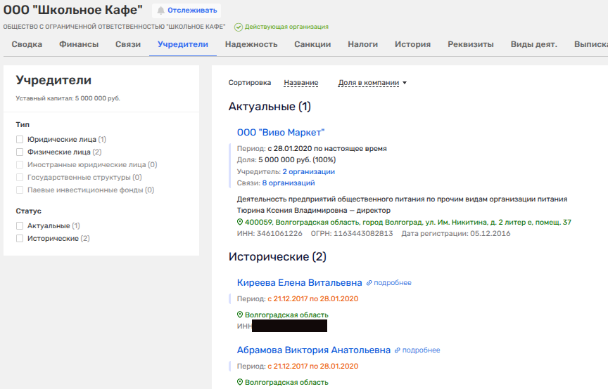 И вот в том же 2020 году некое ООО «Школьное кафе» с одним сотрудником, созданное в 2017 году Еленой Киреевой и Викторией Абрамовой, заявляет о желании получить в концессию школьные столовые и пищеблоки.