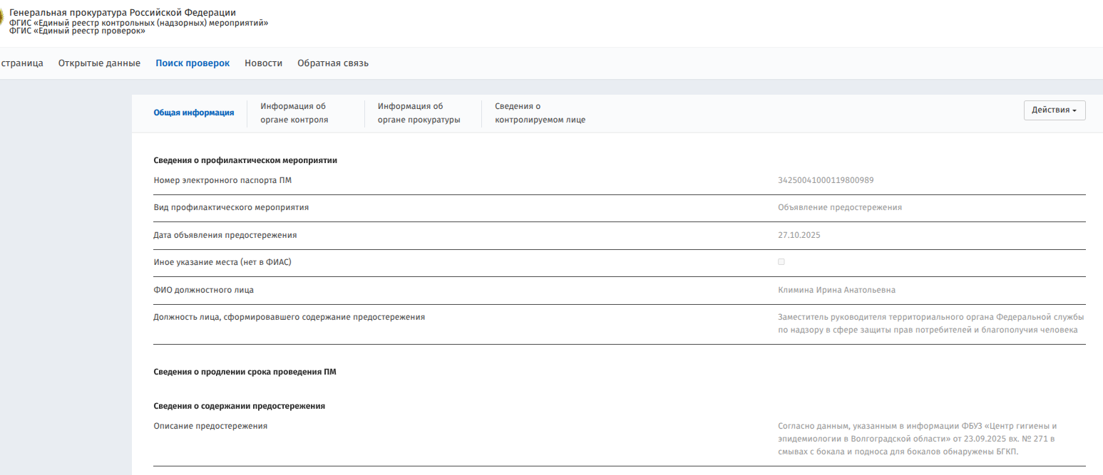 Судя по всему, фирма заколачивает миллиарды, походя поплевывая на здоровье школьников и учителей, продолжая нарушать санитарные нормы. Так, в 27 октября 2025 года компании Шейгеревич вынесли предостережение, так как согласно данным, указанным в информации ФБУЗ «Центр гигиены и эпидемиологии в Волгоградской области» от 23.09.2025 вх. № 271 в смывах с бокала и подноса для бокалов обнаружены БГКП. Последнее - это бактерии группы кишечной палочки.