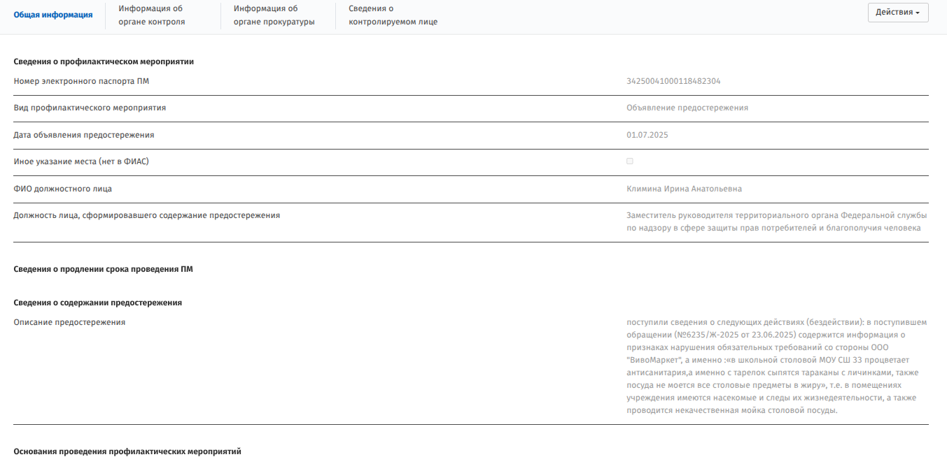 В июле 2025 года предостережение Роспотребнадзором было объявлено после получения обращения о признаках нарушения обязательных требований со стороны ООО "Виво Маркет", а именно: «в школьной столовой МОУ СШ 33 процветает антисанитария, а именно с тарелок сыпятся тараканы с личинками, также посуда не моется все столовые предметы в жиру», т.е. в помещениях учреждения имеются насекомые и следы их жизнедеятельности, а также проводится некачественная мойка столовой посуды.