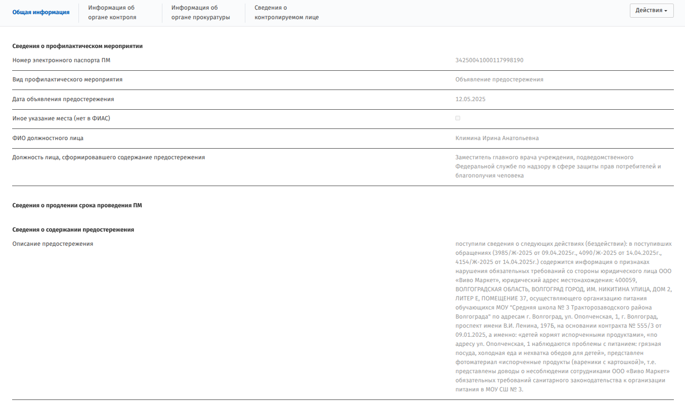 В мае 2025 года предостережение прилетело после трех обращений о том, что в школе № 3 Тракторозаводского района Волгограда «детей кормят испорченными продуктами», «по адресу ул. Ополченская, 1 наблюдаются проблемы с питанием: грязная посуда, холодная еда и нехватка обедов для детей». Тогда же был представлен фотоматериал «испорченные продукты (вареники с картошкой)».