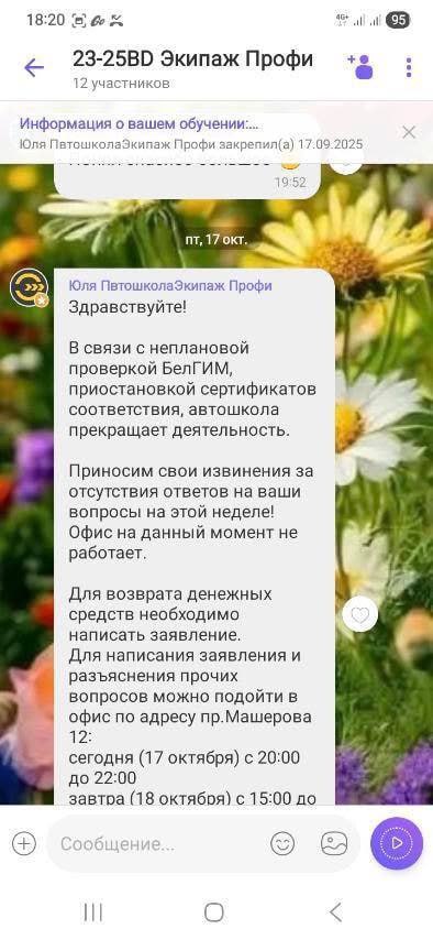 17 октября в чат прислали информацию, что их закрыл БелГим, и школа закрывается, приедьте и напишите заявление на возврат средств!