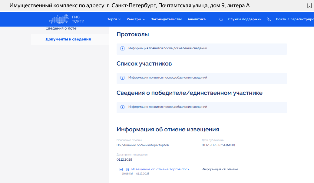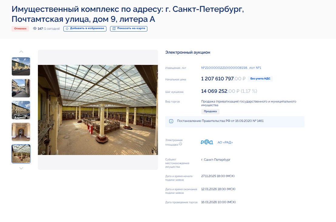 На 16 января 2026 года был объявлен аукцион по продаже имущественного комплекс по адресу: г. Санкт-Петербург, Почтамтская улица, дом 9, литера А, то есть того самого Главпочтамта, который обещали сделать центральной частью арт-квартала.
