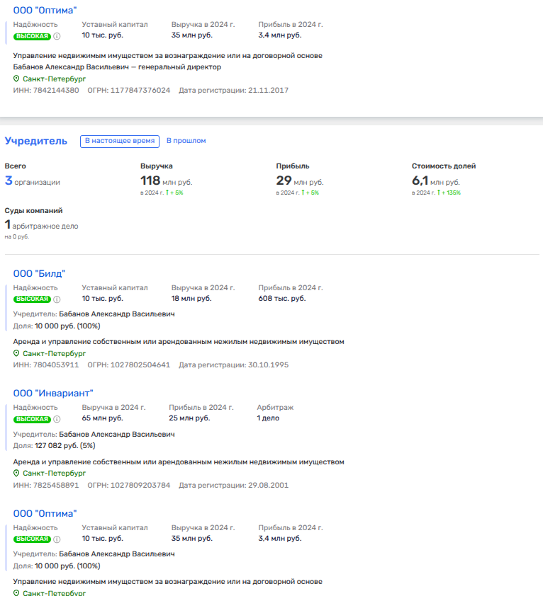 Так, владельцем ООО «Оптима» является Александр Бабанов, которому также принадлежит доля в ООО «Инвариант». По последнему совладельцем является Евгений Давидан - бизнес-партнер миллиардера Захара Смушкина.