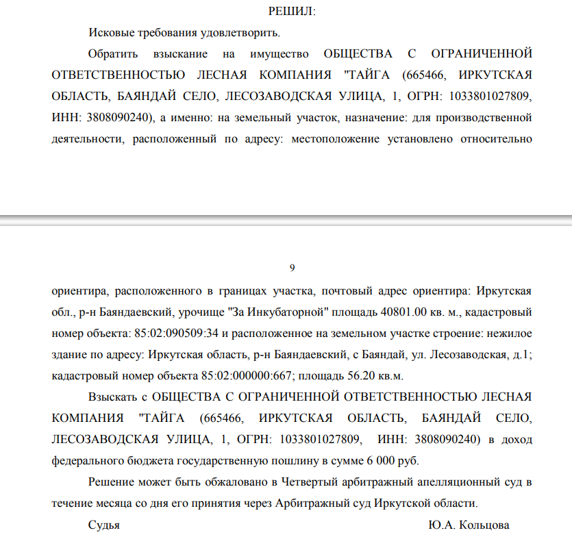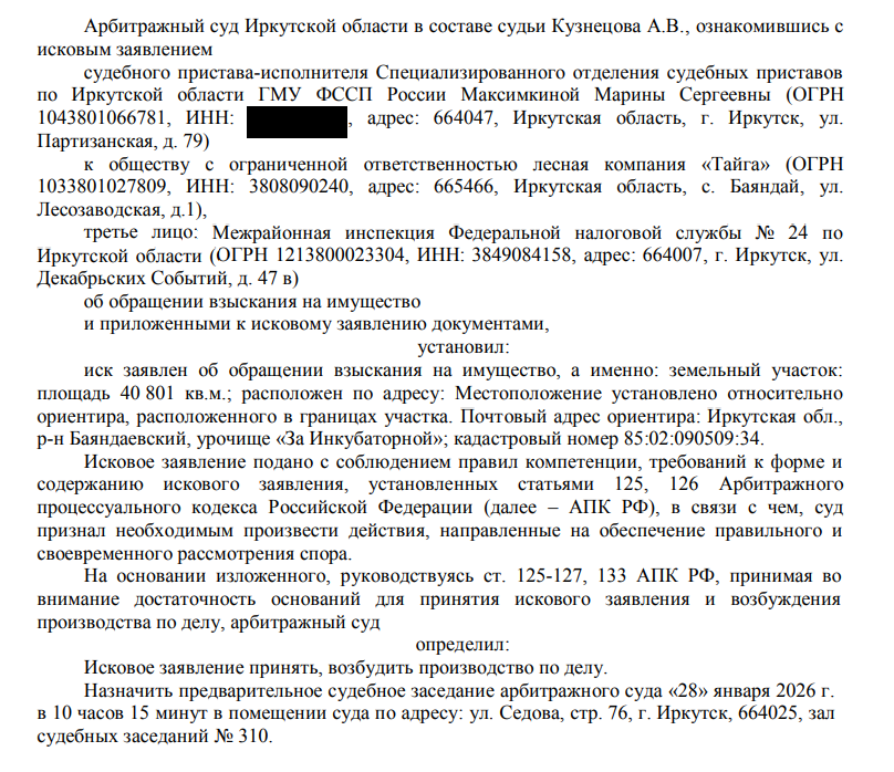 28 января 2026 года в иркутском арбитраже будут слушать иск судебного пристава-исполнителя Специализированного отделения судебных приставов по Иркутской области ГМУ ФССП России Марины Максимкиной к ООО Лесная компания «Тайга». Третьим лицом в деле участвует Межрайонная инспекция Федеральной налоговой службы № 24 по Иркутской области, потому как в деле речь идёт об изъятии крупного надела за налоговые долги.