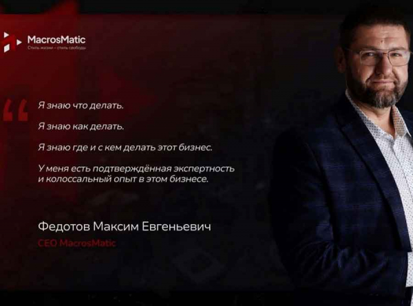 Я пострадавший от MacrosMatic. Сейчас опубликовали все доказательства обмана Федотова в своем канале с пострадавшими. Канал: https://t.me/+xEiWgtscYPk3ZGFi.