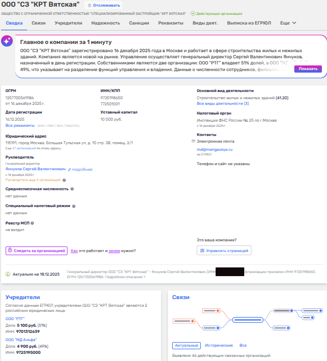 Занятно, что все фирмы - и само СЗ «КРТ Вятская» и его владельцы учреждены в 2025 году, то есть это абсолютно свеженькие юрлица. Вот только картину всей этой благостности портит фамилия директора СЗ «КРТ Вятская» - Сергей Янчуков.