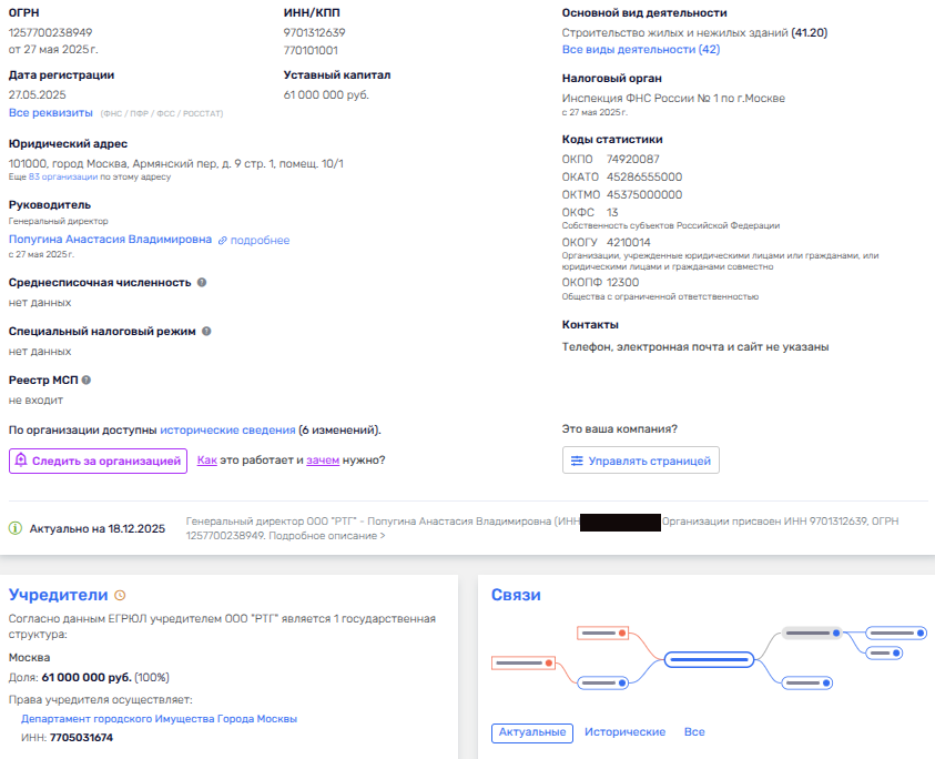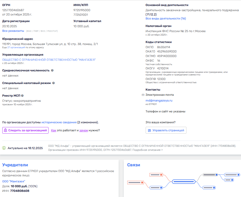 Владельцами застройщика стали ООО «МД Альфа», принадлежащая девелоперу «Мангазея», и ООО «Развитие Территорий Города» (РТГ), подконтрольное департаменту городского имущества Москвы.