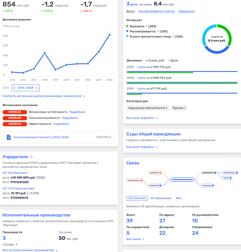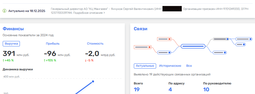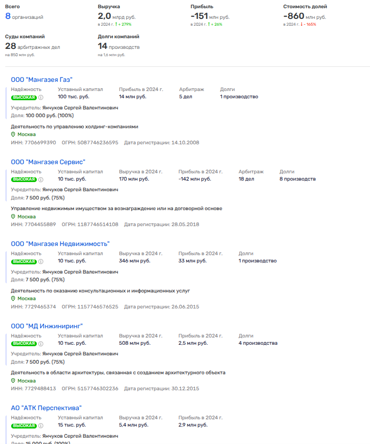 Именно одиозному Янчукову и принадлежит весь дивизион «Мангазея». И что интересно, при заявленных 20 млрд рублей инвестиций, у головной ООО «Мангазея» по итогам 2024 года был огромный убыток - 1,2 млрд рублей. Кроме того, у собственника ООО «Мангазея» - АО КЦ «Мангазея» также дела не очень: убыток составил 96 млн рублей. А это на минуточку - головные фирмы дивизиона, на которые оформлены многочисленные дочерние юрлица. И везде директором - сам Янчуков.