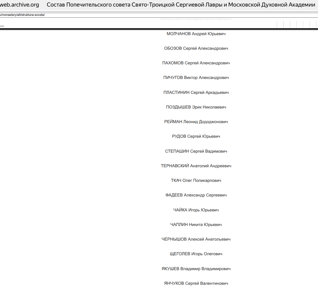 Круг знакомств Янчукова также можно увидеть в списке попечительского совета Свято-Троицкой Сергиевой лавры, где он сам и фигурировал. Тут и глава Сбера Герман Греф, и все тот же Чемезов. Там же министр обороны Андрей Белоусо, губернатор Петербурга Александр Беглов и даже сын бывшего генпрокурора РФ Чайки и многие иные известные лица. С некоторых пор лавра своих покровителей скрывает, но Сеть помнит всё.
