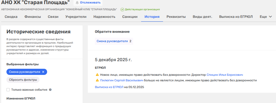 Кстати, Спицин в АНО «ХК Старая Площадь» как раз 5 декабря 2025 года сменил на посту главы Сергея Пилюгина, связанного как раз таки с Ночной хоккейной лигой.