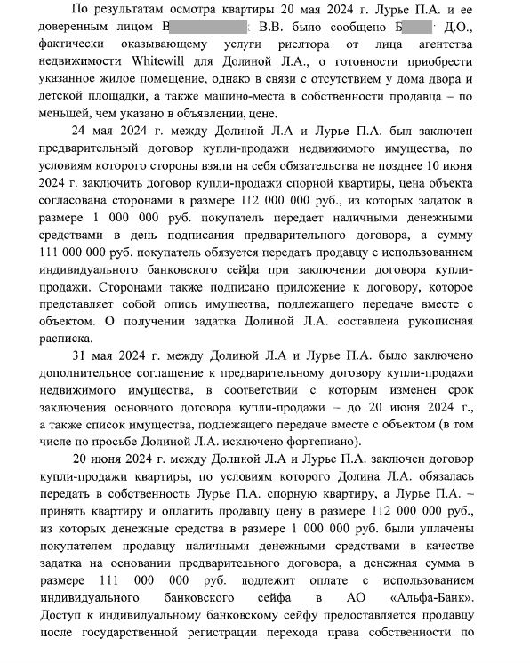 Например, Долина требовала расторгнуть сделку, но деньги не готова была возвращать, так как отдала их мошенников (те действительно были, но уже получили свои сроки за этот и другие эпизоды). Вот только деньги от покупателя она получала сама, а куда потом их дела - это ее личное дело. Хоть серпантин нарезала.