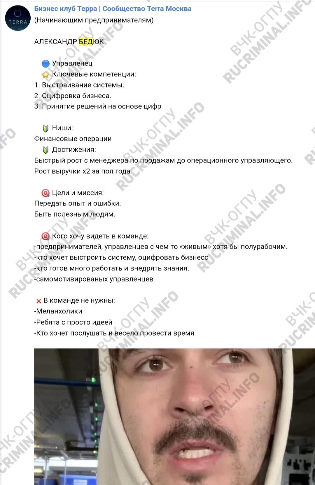Бедюк — действующий наставник клуба «ТЕРРА» и давний соратник Расулова по «Каббала-центру». Именно он курирует направления, связанные с цифровыми активами, а также контролирует схемы финансового взаимодействия между дочерними проектами холдинга.