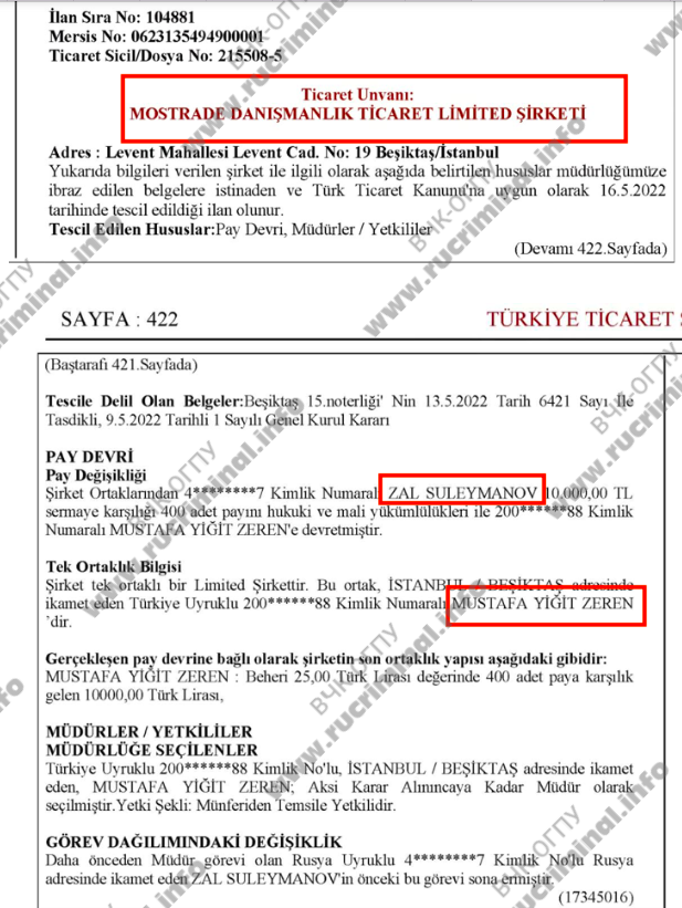 Зерены вели дела с одноклассником сына Эрдогана, Халилом Ибрагимом Бакачи. В Турции его называют кошельком Эрдогана, управляющим его активами. Бакачи обеспечил «Мострейду» все нужные лицензии и разрешения, но при этом турецкий Mostrade для доступа к турецкой банковской системе пришлось переписать на гражданина Турции Мустафу Зерена. Это было сделано 16 мая 2022 года.