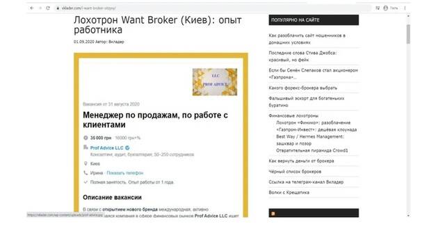 Two brands work (or used to work) under the company Prof Advice LLC - the twins Want Trade and Want Broker (it’s like a rebranding, but without problems), which are actively recruiting workers. Addresses, names, brands change... but a scammer is always a scammer.