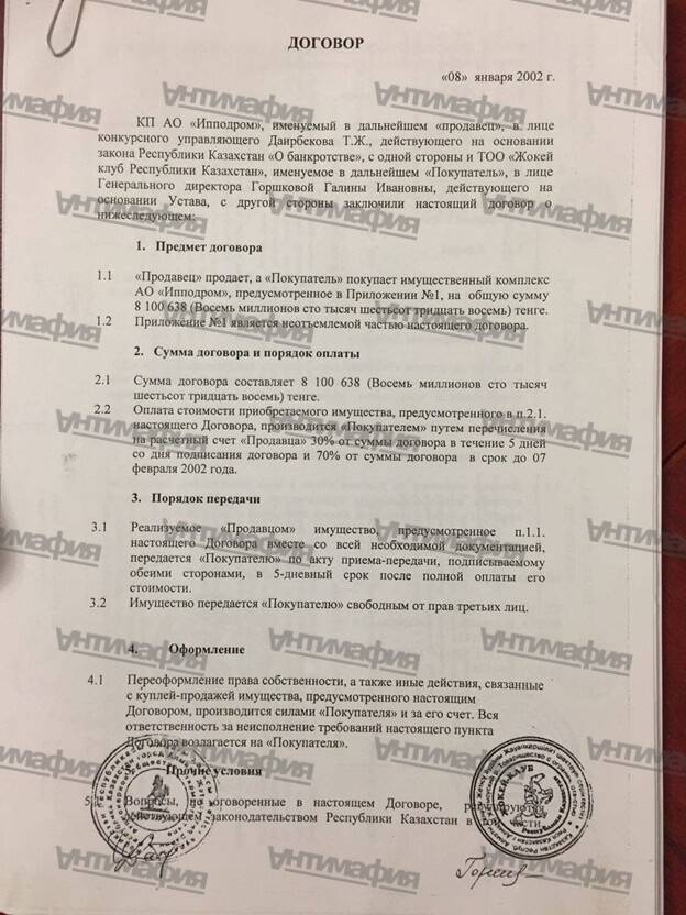 In a 2002 contract, the owner of the territory was listed as a certain JSC "Hippodrome." However, due to debts to banks, the company sold the hippodrome to the organization "Jockey Club of the Republic of Kazakhstan."