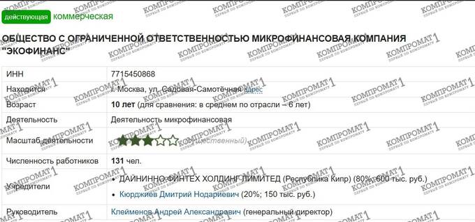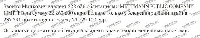 И здесь мы возвращаемся к облигациям на сумму в 50 миллионов евро, которыми владеют и Мичкович. Вызывает сомнения, что они имели деньги на покупку этих облигаций – Звонко Мичкович, как уже упоминалось, является владельцем ООО «Трансполимер». А Александр через Dyninno Fintech Holding Limited контролирует микрофинансовую компанию «Экофинанс».