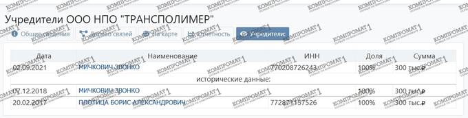А уж дальше совсем просто. Звонко Мичкович является владельцем ООО «Трансполимер» (ИНН 7706604303), но в свое время учредителем фирмы был Борис Плотица, переуступивший затем корпоративные права Звонко Мичковичу.