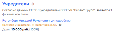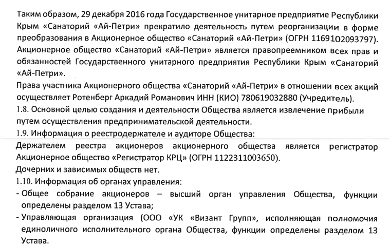 Все санатории находятся под управлением ООО УК «Визант Групп», чьим владельцев является лично Аркадий Ротенберг. При этом при покупке, на торгах, его интересы прикрывало другое юрлицо - ООО «Управляющая компания инфраструктурных проектов» (УКИП), чьим владельцем как раз и было УК «Визант Групп». Владельца УК в те годы прятали за ЗПИФ - тот самый, которому потом ушел и УКИП.