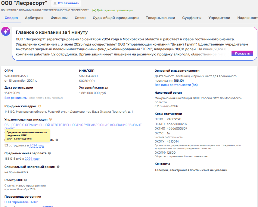 Между тем под управлением УК «Визант Групп» также с июня 2025 года находится гостиничное «Лесресорт» из п. Дорохово в Подмосковье. Это оператор элитного загородного отеля «LES Art Resort», включающего рестораны, SPA, бассейны и развлекательные центры. Проживание в этом отеле обойдется в среднюю зарплату для многих регионов: 30-60 тыс. рублей за сутки.