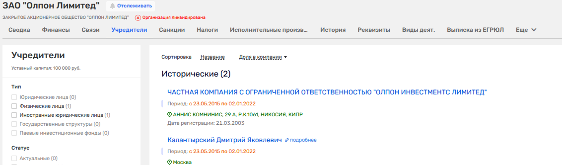 Ранее кипрское OLPON владело ЗАО «Олпон Лимитед», вместе с неким Дмитрием Калантырским - уроженцем Украины, который работал в СМП-Банк Ротенбергов, дослужившись до президента банчка.