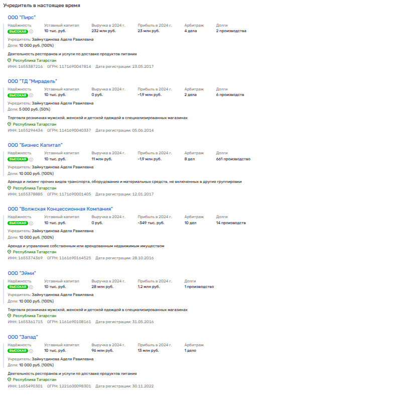 Помимо этого, мадам Зайнутдинова владеет парочкой ресторанных фирм, компанией по аренде и лизингу транспорта, а еще на нее оформлена некая ООО «Волжская Концессионная Компания», которая подозрительно похожа на фирму-заготовку под освоение бюджетных денег под какую-то концессию.