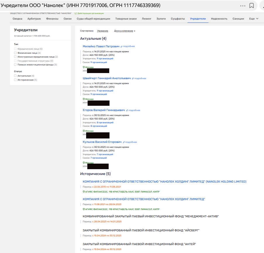Итак, 30 декабря 2025 года в ЕГРЮЛ в ООО «Нанолек» 50% перешли от ЗПИФ к двум физлицам - Василию Егоровичу Кулькову и Валерию Егорову. Эти двое дособрали квартет из доверенных лиц друга семьи Голиковой Харитонина, добавившись к Геннадию Швейгерту и Павлу Милейко, также партнерам Харитонина.